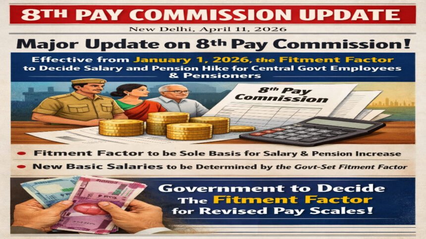 8th Pay Commission नई दिल्ली, 11 अप्रैल 2026। केंद्र सरकार के लाखों कर्मचारियों और पेंशनभोगियों के लिए 8वें वेतन आयोग को लेकर बड़ा अपडेट सामने आया है। 1 जनवरी 2026 से प्रभावी माने जा रहे इस पे कमिशन के तहत सैलरी और पेंशन में बढ़ोतरी का पूरा आधार फिटमेंट फैक्टर होगा। सरकार द्वारा तय किए जाने वाले इस फैक्टर के आधार पर ही कर्मचारियों की नई बेसिक सैलरी निर्धारित की जाएगी।