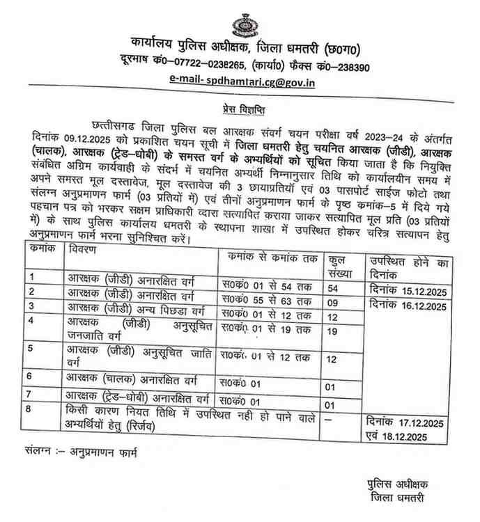 Aarakshak Chayan , रायपुर। छत्तीसगढ़ जिला पुलिस बल आरक्षक संवर्ग चयन परीक्षा वर्ष 2023-24 के अंतर्गत चयनित अभ्यर्थियों के लिए महत्वपूर्ण सूचना जारी की गई है। 09 दिसंबर 2025 को घोषित चयन सूची में धमतरी जिले हेतु चयनित आरक्षक (जीडी), आरक्षक (चालक) तथा आरक्षक (ट्रेड–धोबी) के सभी अभ्यर्थियों के लिए दस्तावेज़ सत्यापन की तिथि और निर्देश विभाग की ओर से घोषित कर दिए गए हैं।