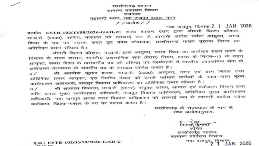 रायपुर, 21 जनवरी। छत्तीसगढ़ शासन ने प्रशासनिक स्तर पर फेरबदल करते हुए तीन आईएएस अधिकारियों के तबादले के आदेश जारी किए हैं। सामान्य प्रशासन विभाग द्वारा जारी आदेश के अनुसार अधिकारियों को नवीन पदस्थापना दी गई है।