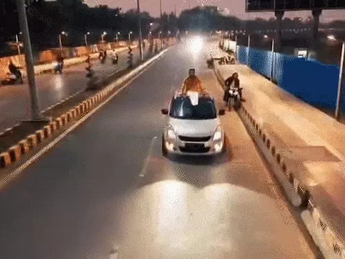 सोशल मीडिया पर वायरल हुए वीडियो में युवक कार की छत पर बैठा दिखाई देता है। खतरनाक तरीके से दौड़ती कार के साथ वह लोगों को चुनौती देते हुए कहता है—