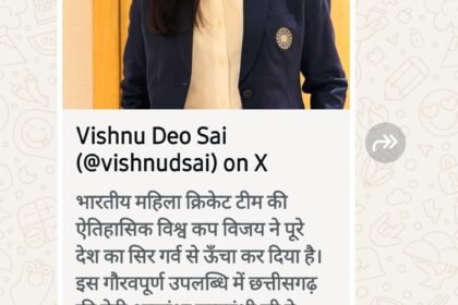 रायपुर 5 नवम्बर 2025/मुख्यमंत्री श्री विष्णु देव साय ने सोशल मीडिया प्लेटफार्म एक्स पर भारतीय महिला क्रिकेट टीम की ऐतिहासिक…