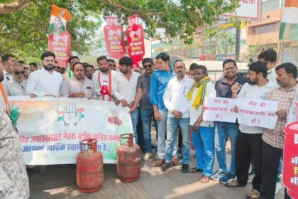 तेलीबांधा तालाब में गैस सिलेंडर विसर्जन’ महंगाई और कालाबाजारी के खिलाफ कांग्रेस का अनोखा विरोध
