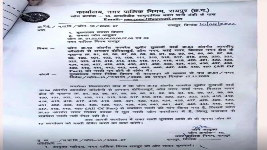 रायपुर। छत्तीसगढ़ की राजधानी रायपुर में नगर निगम के जोन 10 अमलीडीह कार्यालय से करीब 100 एकड़ बेशकीमती जमीन से जुड़ी महत्वपूर्ण फाइलें गायब होने का सनसनीखेज मामला सामने आया है। इस बड़ी लापरवाही के उजागर होने के बाद निगम प्रशासन ने सख्त रुख अपनाते हुए संबंधित जोन कमिश्नर को पद से हटाकर मुख्यालय अटैच कर दिया है। गायब हुई फाइलों में बोरियाकला इलाके के ओम नगर, साईं नगर और बिलाल नगर क्षेत्र के 69 भूखंडों के लेआउट और वैध-अवैध निर्माण की विस्तृत जानकारी शामिल थी। आशंका जताई जा रही है कि बिल्डरों को अनुचित लाभ पहुँचाने के उद्देश्य से सोची-समझी साजिश के तहत इन सरकारी दस्तावेजों को खुर्द-बुर्द किया गया है।