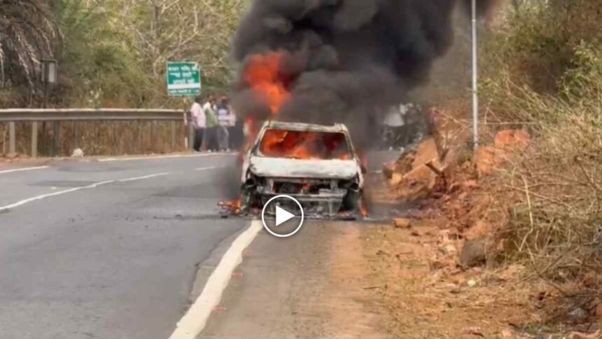 Chhattisgarh Road Safety Alert , दंतेवाड़ा — कोड़ेनार थाना क्षेत्र के बास्तानार घाट पर रविवार को उस वक्त सन्नाटा टूट गया जब एक चलती कार अचानक धू-धू कर जलने लगी। नेशनल हाईवे पर सफर कर रहे यात्रियों के लिए यह किसी डरावने सपने जैसा था। इंजन से धुआं निकलने के चंद सेकंड के भीतर ही पूरी कार आग की लपटों से घिर गई। ड्राइवर ने सूझबूझ दिखाते हुए तुरंत ब्रेक लगाए और सभी सवार सुरक्षित बाहर कूद गए।