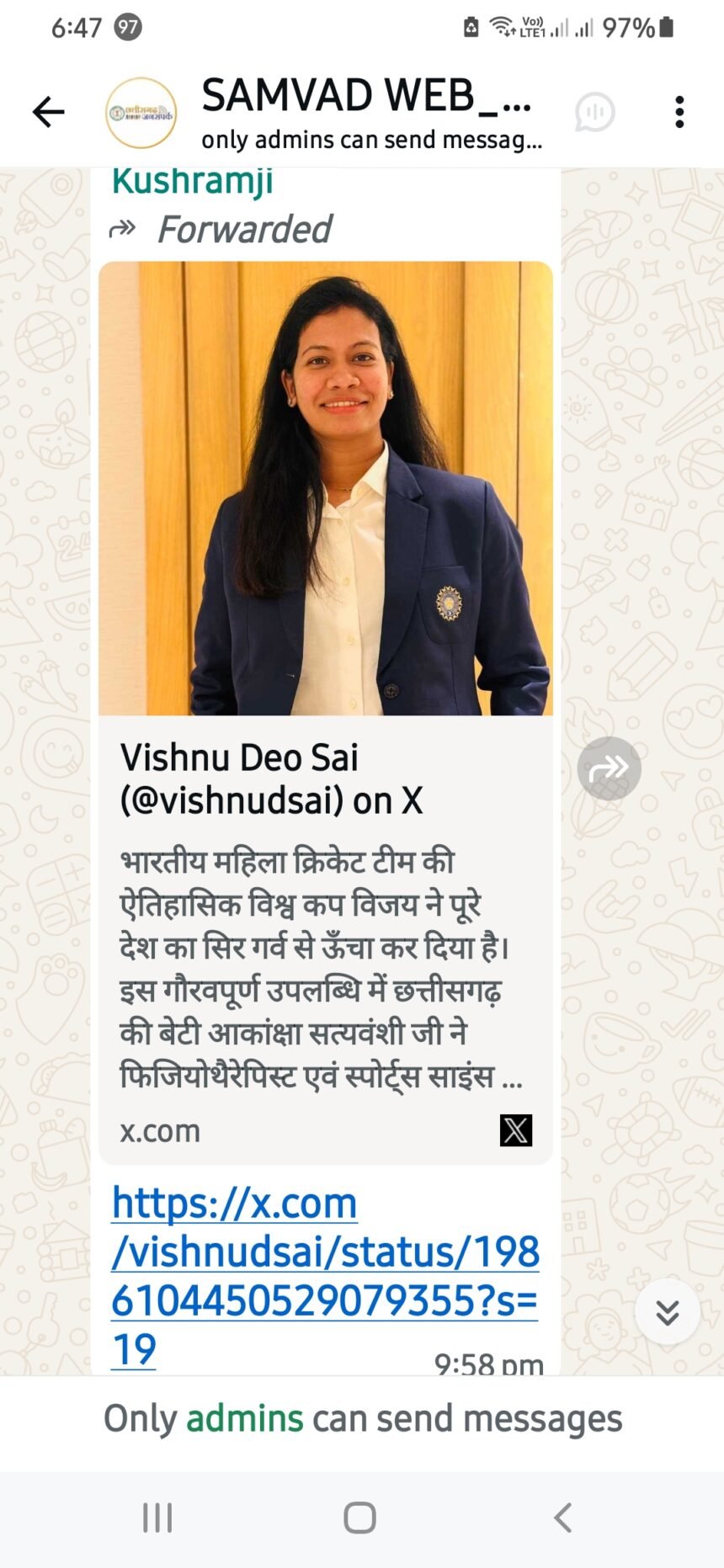 मुख्यमंत्री श्री साय ने कहा कि इस गौरवपूर्ण सफलता में छत्तीसगढ़ की बेटी आकांक्षा सत्यवंशी ने फिजियोथैरेपिस्ट एवं स्पोर्ट्स साइंस विशेषज्ञ के रूप में खिलाड़ियों की फिटनेस और रिकवरी में अतुलनीय योगदान देकर न केवल भारतीय टीम को सशक्त बनाया है, बल्कि देश का नाम अंतरराष्ट्रीय मंच पर उज्ज्वल किया है।
