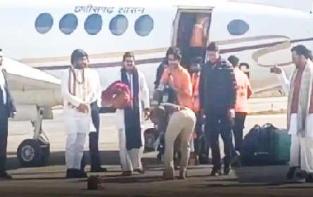 रायपुर। कथावाचक धीरेंद्र शास्त्री रायपुर सरकारी विमान से पहुंचे और इस दौरान अपने अनुयायियों के सामने जूते-टोपी उतारकर पैर छुए। इस मौके पर राज्य के मंत्री खुशवंत सिंह भी उनके साथ मौजूद रहे।