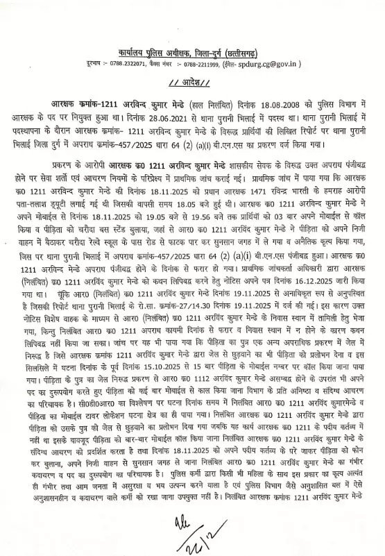 पीड़ित महिला ने पुलिस में दर्ज शिकायत में बताया कि उसका बेटा एक आपराधिक मामले में जेल में बंद है। इसी का फायदा उठाकर पुरानी भिलाई थाना क्षेत्र में पदस्थ आरक्षक अरविन्द कुमार मेन्ढे ने नवंबर 2025 में महिला को फोन कर थाने बुलाया और बेटे को जेल से छुड़ाने का झांसा दिया।