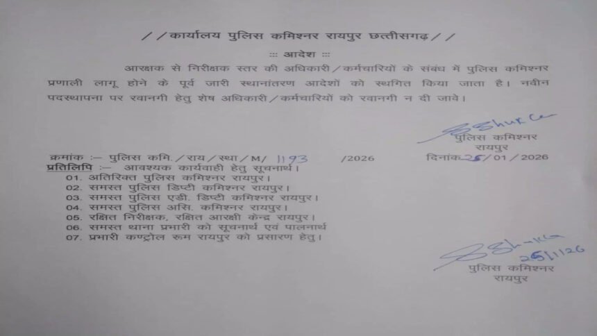 पुलिस कमिश्नर द्वारा जारी आधिकारिक आदेश के अनुसार, रायपुर जिले में कमिश्नर प्रणाली लागू होने से पूर्व आरक्षक से लेकर निरीक्षक (Inspector) स्तर तक के जितने भी स्थानांतरण आदेश जारी किए गए थे, उन्हें फिलहाल स्थगित कर दिया गया है। आदेश में स्पष्ट किया गया है कि जो कर्मचारी नई पदस्थापना के लिए अब तक रवाना नहीं हुए हैं, उन्हें रवानगी न दी जाए।