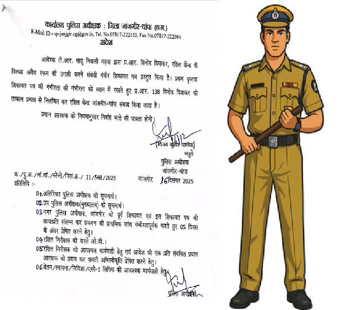 निलंबन आदेश में स्पष्ट किया गया है कि शिकायत पत्र की प्रथम दृष्टया गंभीरता को देखते हुए प्रधान आरक्षक विनोद दिवाकर को तत्काल प्रभाव से निलंबित किया जाता है। निलंबन अवधि के दौरान उन्हें रक्षित केंद्र जांजगीर-चांपा से संबद्ध किया गया है।