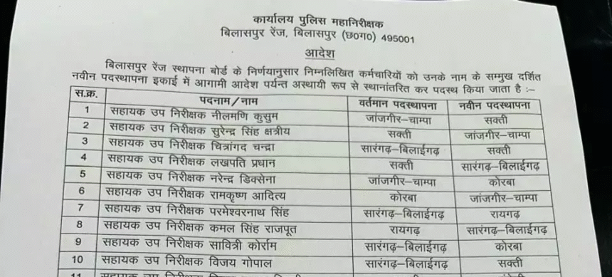 बिलासपुर। बिलासपुर रेंज के आईजी डॉ. संजीव शुक्ला ने रेंज स्तर पर दो दर्जन पुलिसकर्मियों के तबादले किए हैं। इसमें एक जिले से पुलिसकर्मियों को दूसरे जिले में स्थानांतरित किया गया है।