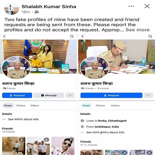 आईपीएस शलभ सिन्हा ने अपने आधिकारिक फेसबुक अकाउंट पर लिखा कि ” मेरे दो फर्जी प्रोफाइल बनाए गए हैं और इनसे फ्रेंड रिक्वेस्ट की जा रही है. कृपया प्रोफाइल की रिपोर्ट करें और रिक्वेस्ट को स्वीकार न करें. हमारी ओर से उचित कार्रवाई की जा रही है.