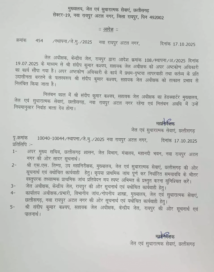 Sandeep Kumar Kashyap Suspension रायपुर, 18 अक्टूबर 2025। रायपुर केंद्रीय जेल के सहायक अधीक्षक संदीप कुमार कश्यप को तत्काल प्रभाव से निलंबित कर दिया गया है। जेल अधीक्षक के आदेश (क्रमांक 108/स्थापना/अ/2025 दिनांक 19.07.2025) में कहा गया है कि अपर अष्टकोण अधिकारी के कार्य में प्रथम दृष्टया लापरवाही और कर्तव्य के प्रति उदासीनता बरतने के कारण उन्हें निलंबित किया गया है।